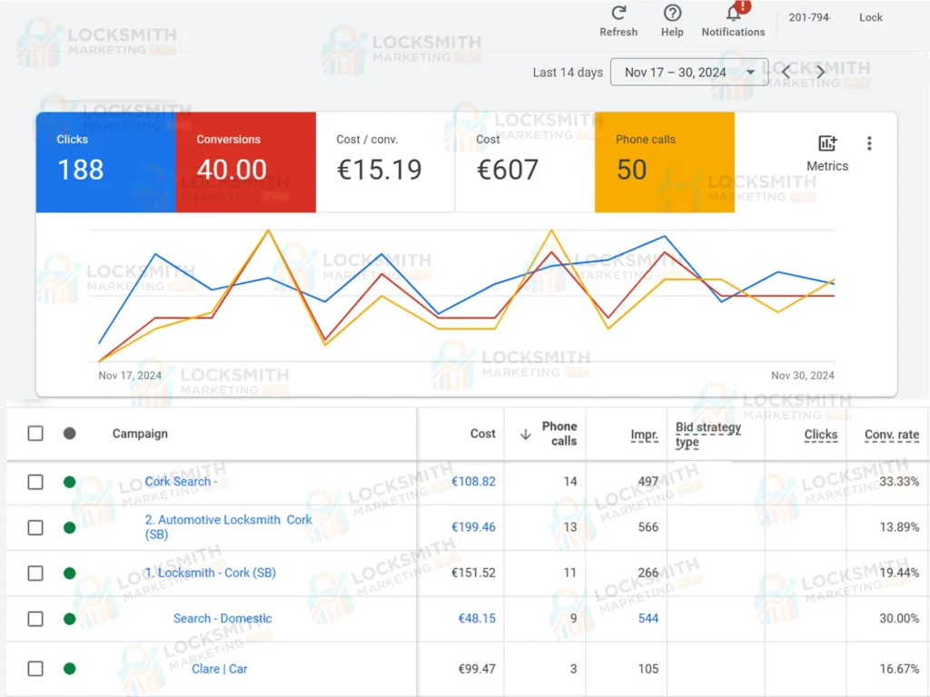 This Ireland based client was paying between $60 and $62 per call before working with me. After managing the ads for only seven days, I reduced the cost per call by more than sixty percent. The client now receives calls for just $12 to $14 each, creating a highly cost effective and profitable campaign.
